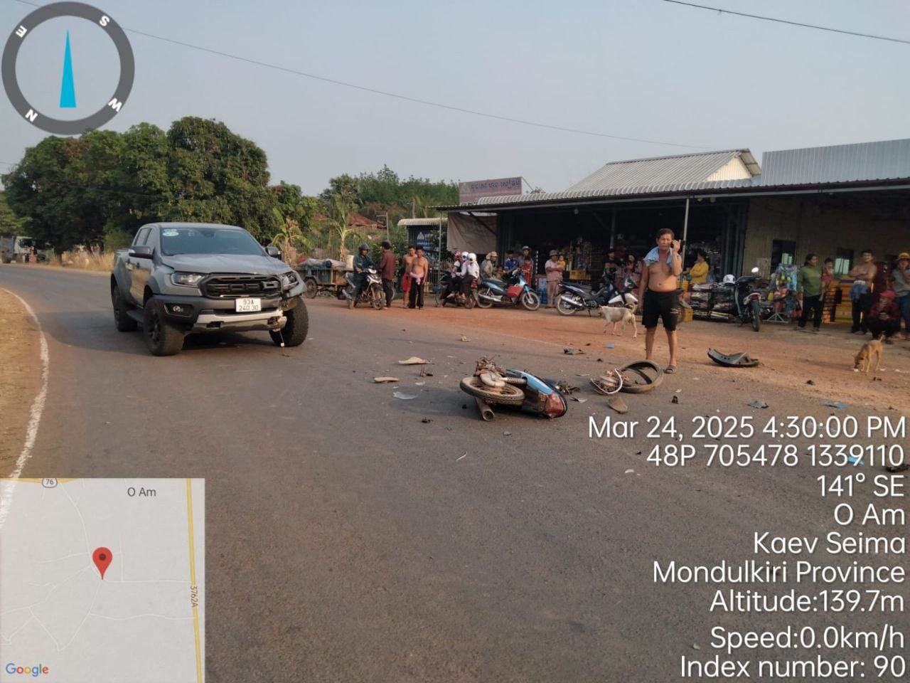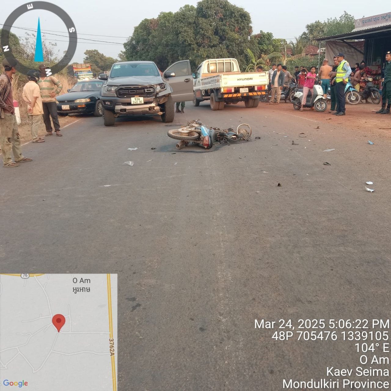 សេចក្តីរាយការណ៍បានឲ្យដឹងថា នៅវេលាម៉ោង ១៦ និង២០ នាទី ថ្ងៃទី ២៤ ខែមីនា ឆ្នាំ២០២៥ នៅចំណុចឆ្កែអើត ផ្លូវឆ្ពោះទៅព្រំដែនកម្ពុជា វៀតណាម ស្ថិតនៅភូមិអូរអាម ឃុំស្រែខ្ទុម ស្រុកកែវសីមា មានករណីគ្រោះថ្នាក់ចរាចរណ៍មួយបានកើតឡើង រវាងម៉ូតូ និងរថយន្ត បើកបរបញ្ច្រាសទិសគ្នា ដោយម៉ូតូបើកបរពីជើងទៅត្បូង។ ចំណែករថយន្តបើកបរពីត្បូងទៅជើង។អ្នកបើកបរម៉ូតូឈ្មោះ ចិត្ត បញ្ញា ភេទប្រុស អាយុ ២៨ ឆ្នាំ ជនជាតិខ្មែរ មុខរបរ កសិករ ស្លាប់នៅនឹងកន្លែងកើតហេតុ បើកបរមូតូម៉ាកវេវឆ្លាម ពណ៌ទឹកសមុទ្រ គ្មានពាក់ស្លាកលេខ មិនមានមួកសុវត្ថិភាព។ រីឯអ្នកបើកបររថយន្ត ជាជនជាតិវៀតណាម បានគេចចេញពីកន្លែងកើតហេតុបន្សល់ទុករថយន្តម៉ាក ហ្វ៊តរាបទ័រ ពណ៌ប្រផេះ ពាក់ស្លាកលេខ 93A-240.30 រថយន្តវៀតណាម។