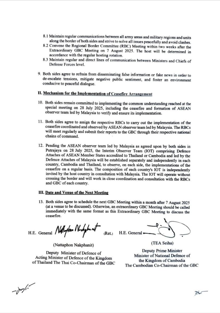 ភាគីទាំងពីរ កម្ពុជា-ថៃបានពិភាក្សានិងឯកភាពគ្នាលើលក្ខខណ្ឌនៃការអនុវត្តបទឈប់បាញ់ និងការបង្កើនការប្រាស្រ័យទាក់ទងគ្នារវាងកងទ័ពទាំងពីរ។ ភាគីទាំងពីរក៏បានយល់ព្រមជំរុញការរៀបចំលក្ខខណ្ឌប្រតិបត្តិនៃយន្តការតាមដានត្រួតពិនិត្យការអនុវត្តបទឈប់បាញ់របស់ក្រុមអ្នកសង្កេតការណ៍អាស៊ាន (ASEAN Observer Team) និងឯកភាពឱ្យមានក្រុមអ្នកសង្កេតការណ៍បណ្តោះអាសន្ន (Interim Observer Team) ដឹកនាំដោយអនុព័ន្ធយោធាម៉ាឡេស៊ីដើម្បីសង្កេតការណ៍ភ្លាមៗ និងបន្តរៀបចំក្រុមអ្នកសង្កេតការណ៍អាស៊ាន (ASEAN Observer Team)។
