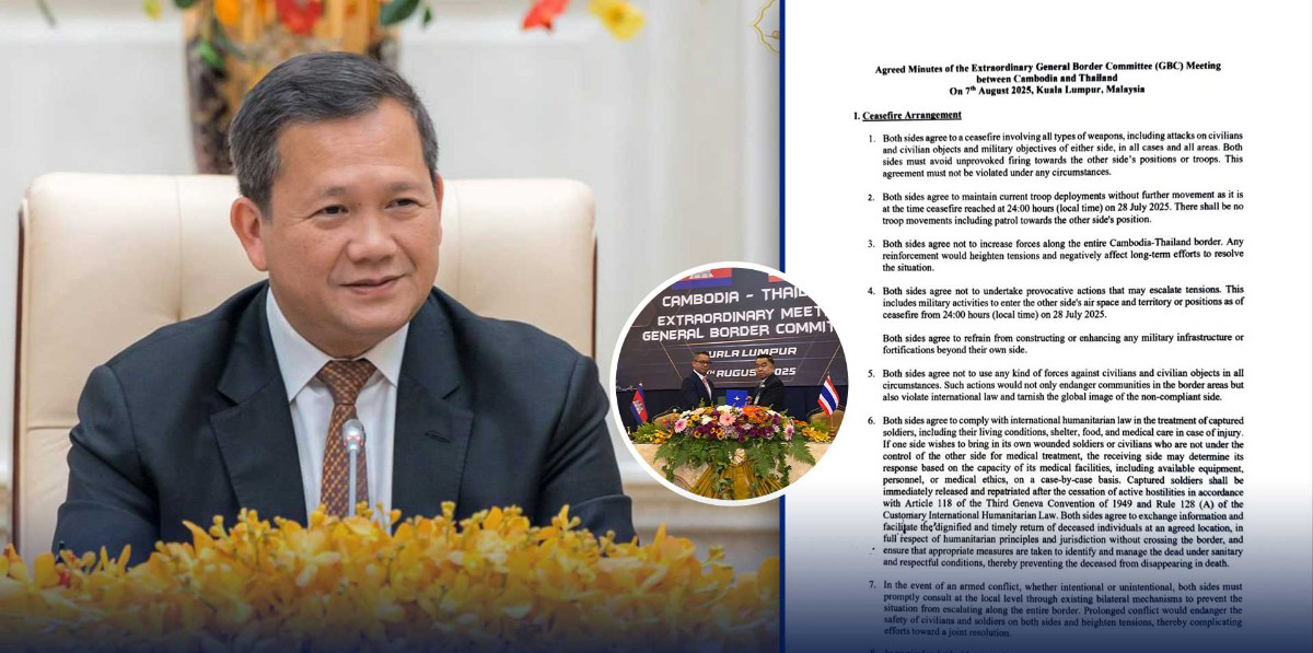 តាមរយៈបណ្ដាញសង្គមនៅរសៀលថ្ងៃទី៧ ខែសីហា ឆ្នាំ២០២៥នេះ សម្ដេចមហាបវរធិបតី ហ៊ុន ម៉ាណែត នាយករដ្ឋមន្ត្រីនៃព្រះរាជាណាចក្រកម្ពុជា បានសម្តែងការអបអរសាទរចំពោះការប្រព្រឹត្តទៅដោយជោគជ័យនូវកិច្ចប្រជុំវិសាមញ្ញនៃគណៈកម្មាធិការព្រំដែនទូទៅ កម្ពុជា-ថៃ (Extraordinary GBC Meeting) ដោយមានការចូលរួមសង្កេតការណ៍ពី ម៉ាឡេស៊ី សហរដ្ឋអាមេរិក និងសាធារណរដ្ឋប្រជាមានិតចិន នាថ្ងៃទី៧ ខែសីហា ឆ្នាំ២០២៥។