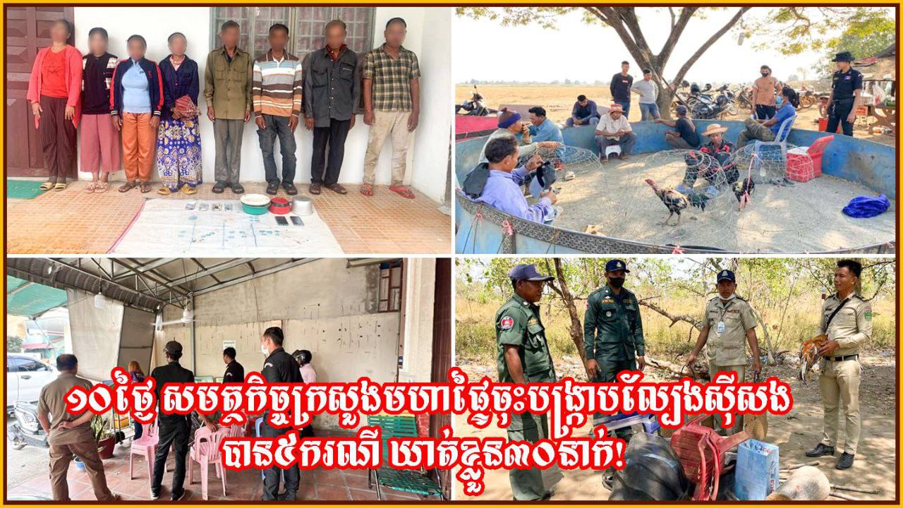 ១០ថ្ងៃ ពោលចាប់ពីថ្ងៃទី ២៧ ខែកក្កដា ដល់ថ្ងៃទី៥ ខែសីហា ឆ្នាំ២០២៥នេះ សមត្ថកិច្ចនៃក្រសួងមហាផ្ទៃបានបើកប្រតិបត្តិការបង្ក្រាបល្បែងស៊ីសងសរុបចំនួន ៥ករណី ឃាត់ខ្លួនអ្នកពាក់ព័ន្ធចំនួន ៣០នាក់។ ក្នុងចំណោម ៣០នាក់ដែលបានឃាត់ខ្លួន មានចំនួន ៣នាក់ ត្រូវបានបញ្ចូនទៅតុលាការ និងអប់រំណែនាំធ្វើកិច្ចសន្យាបញ្ឈប់ចំនួន ២៧នាក់។នេះបើតាមរបាយការណ៍របស់ក្រសួងមហាផ្ទៃ។