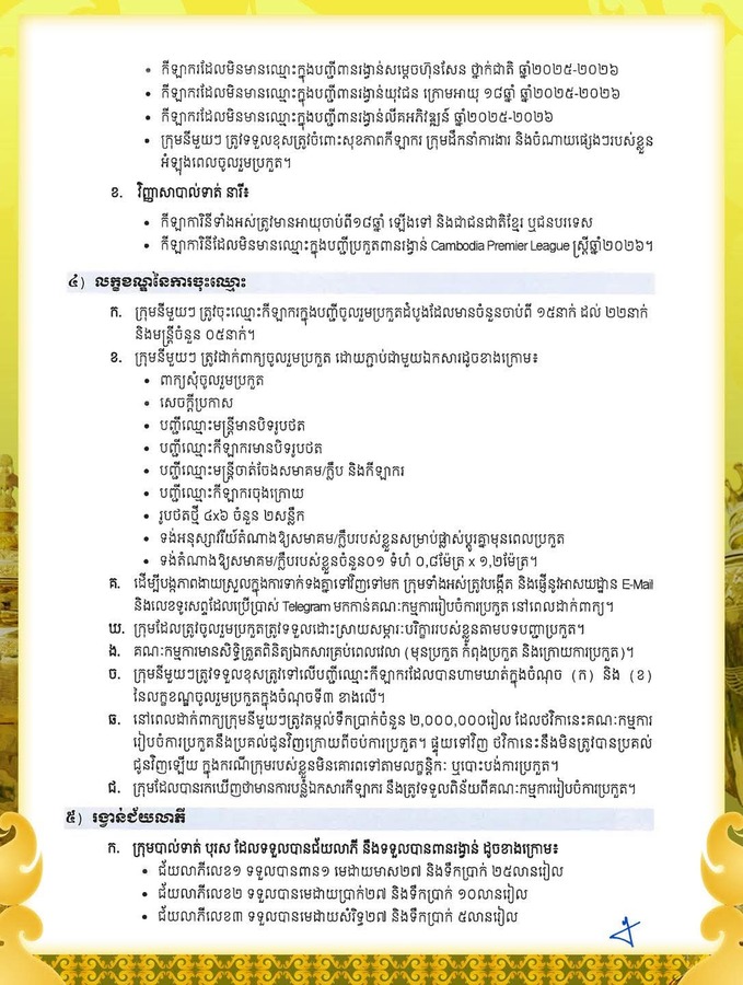 ពាក់ព័ន្ធនឹងផ្នែកហិរញ្ញវត្ថុ និងវិន័យ ក្រុមនីមួយៗត្រូវតម្កល់ទឹកប្រាក់ចំនួន ២,០០០,០០០រៀល នៅពេលដាក់ពាក្យ។ ទឹកប្រាក់នេះនឹងត្រូវប្រគល់ជូនវិញក្រោយបញ្ចប់ការប្រកួត ប៉ុន្តែក្នុងករណីក្រុមណាមួយបោះបង់ការប្រកួត ឬរំលោភលើលក្ខន្តិកៈដែលបានកំណត់ ទឹកប្រាក់តម្កល់នេះនឹងមិនត្រូវបានប្រគល់ជូនវិញឡើយ។